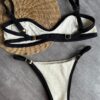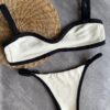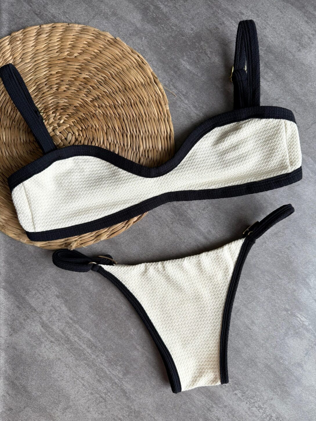Top estilo meia-taça com alças e sustentação firme, tecido texturizado e em um tom off white com contornos em preto, que realçam a silhueta e conferem um toque retrô-chique ao look.
